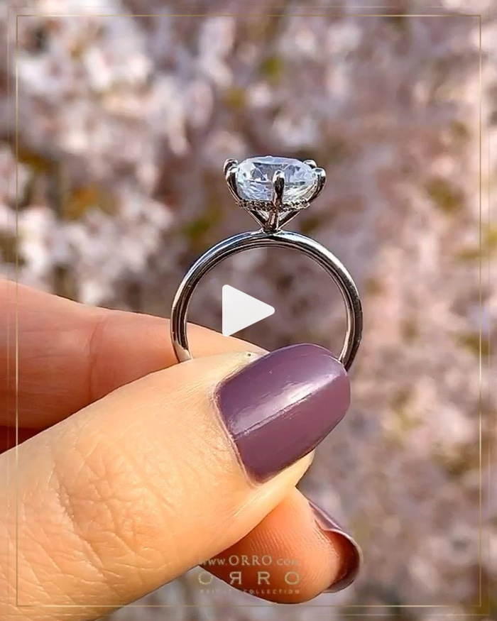 Forever a classic, brilliance begets simple elegance in the ORRO Destinée 6 Pronged Ring. The beauty of this timeless ring lies in its simplicity & subtlety. A Round Brilliant gem is held in place by four hand-crafted talon claws, sitting on a unique halo of little gems encircling the center piece that sits high atop a delicate band that is barely visible when worn.