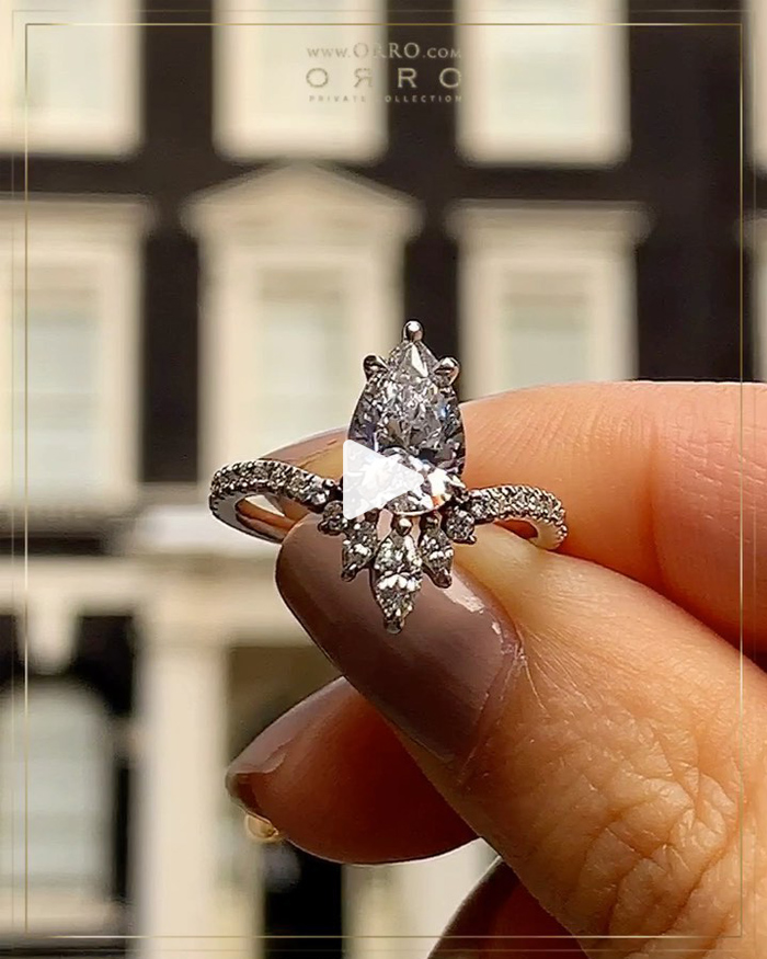 Comes in a 1.50ct Pear Cut center stone.